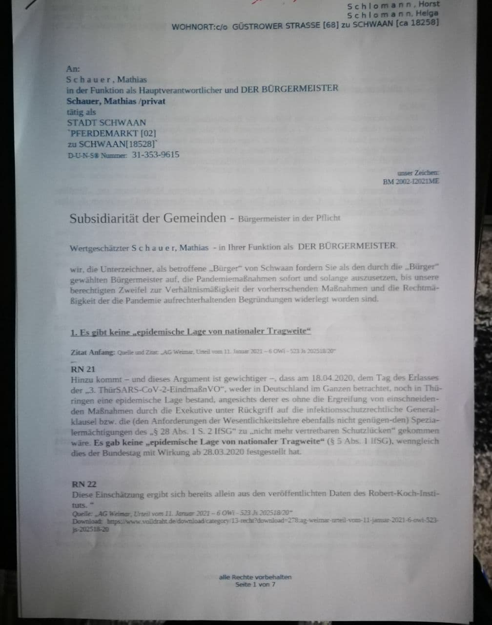 Wertgeschätzter Schuldt, Arne- in Ihrer Funktion als Bürgermeister, wir, die Unterzeichner, als betroffene Bürger von Güstrow, fordern Sie als den durch die Bürger gewählten Bürgermeister auf, die Pandemiemaßnahmen sofort und solange auszusetzen, bis unsere berechtigten Zweifel zur Verhältnismäßigkeit der vorherrschenden Maßnahmen und die Rechtmäßigkeit der die Pandemie aufrechterhaltenden Begründungen widerlegt worden sind.