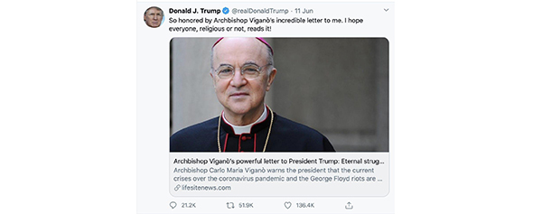 Erzbischof Carlo Maria Viganò hat einen Offenen Brief im Juni 2020 an US-Präsident Trump geschrieben. Darin spricht der Geistliche davon, dass die "Kinder des Lichts" gegen die "Kinder der Finsternis" kämpfen und sichert Trump seine Unterstützung zu.